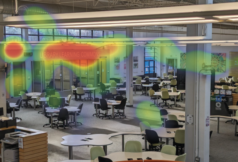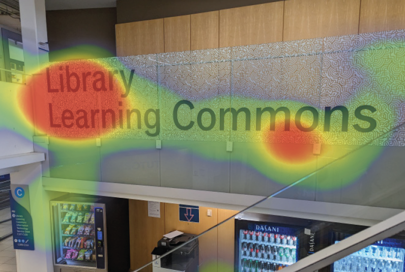 Top left and right: Visualization of participant’s gaze as documented by research assistant in written observation. Heat maps were generated afterwards by reenacting the participant’s gaze using an eye tracking program. Bottom left: Signage in stairwell leading to the Library. Bottom right: Signage at the service desk in the Learning Commons.