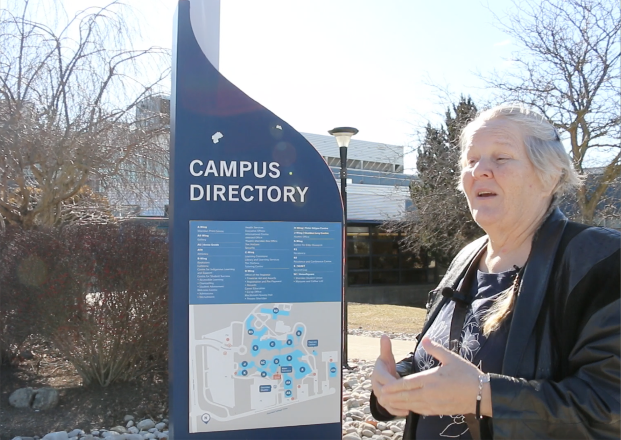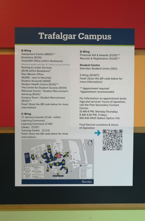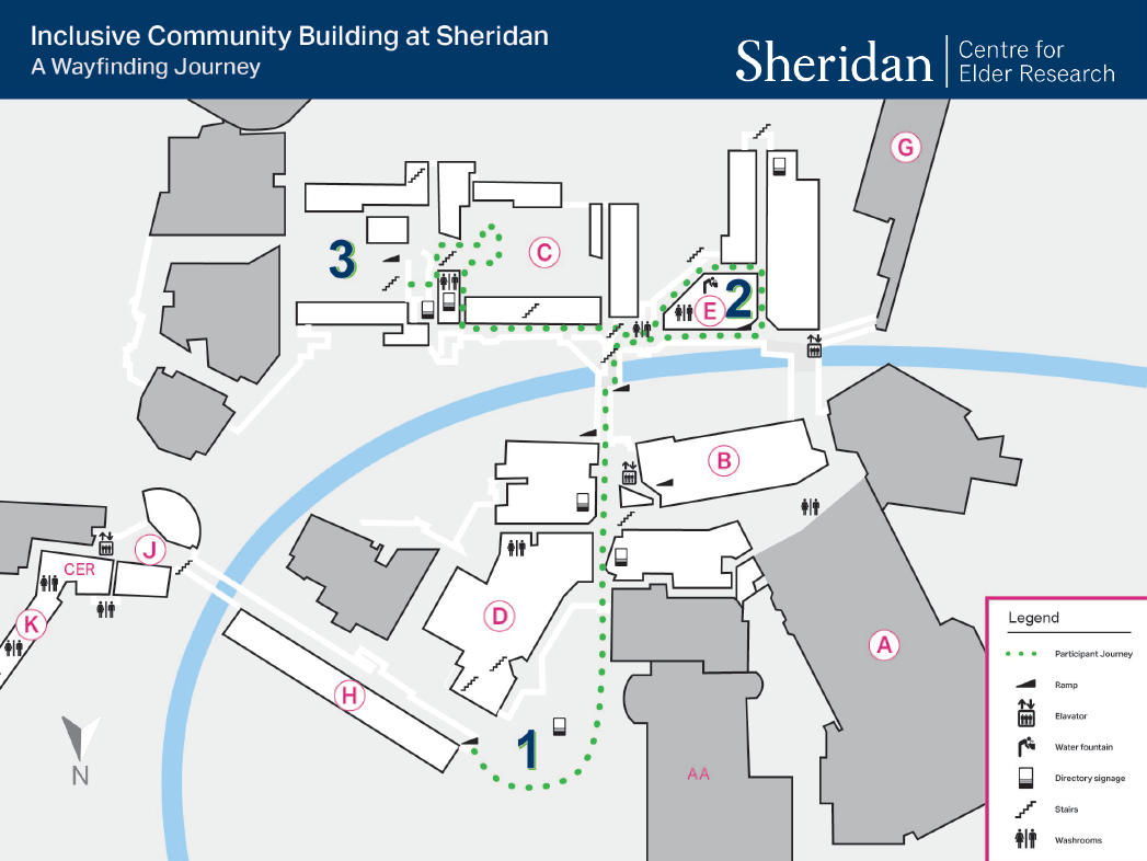 This project sought to better understand the experiences of adults 55+ as they navigated the Trafalgar Campus of Sheridan College. In general, participants were able to successfully navigate the campus, making use of a variety of legible signage options and receiving help from friendly members of the Sheridan community. On the whole, they were confident and optimistic about their journeys, though that confidence diminished slightly upon encountering certain more difficult wayfinding decision points. For example, uncertainty about going up or down a ramp or set of stairs, poor identification of elevator locations, or use of similar words on signs to describe very different destinations caused participants to make errors and increased their confusion.