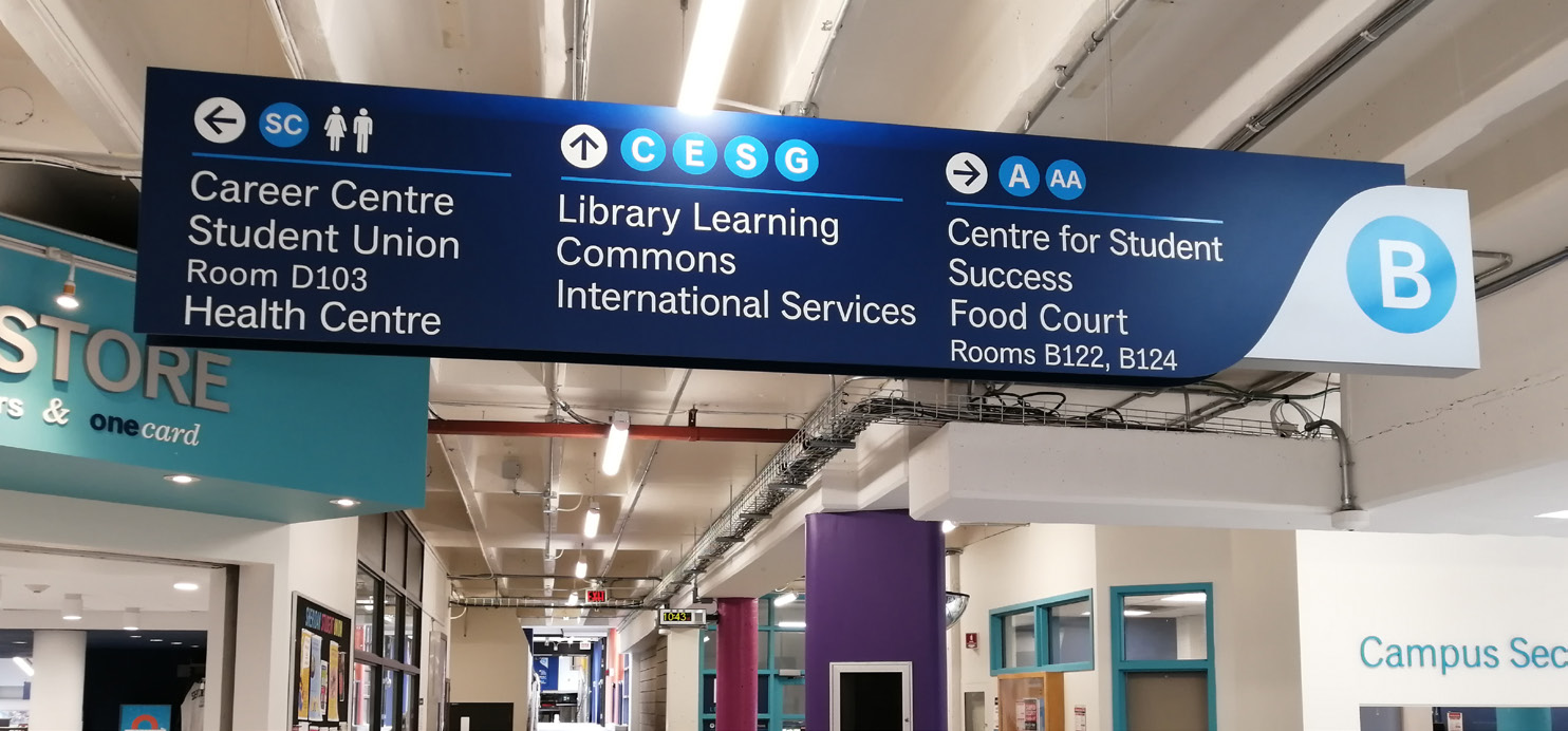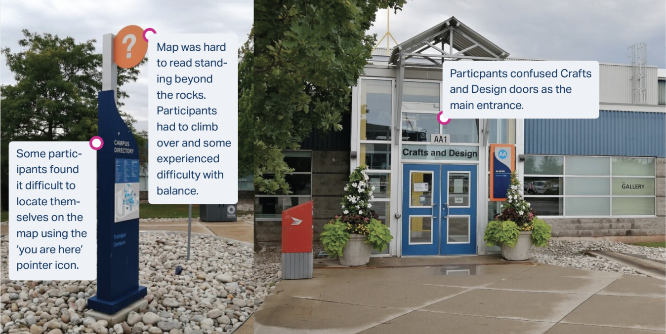 Most participants found the signage at Sheridan College Trafalgar Campus easy to read, comparing favourably with airport or hospital signs for legibility and visual accessibility. However, some noted difficulties reading signs from a distance and interpreting stair symbols without clear directional cues. A common challenge with Directory Maps was locating themselves within the map, with suggestions to add "You are here" indicators to improve navigation.