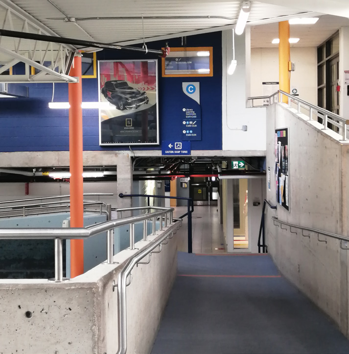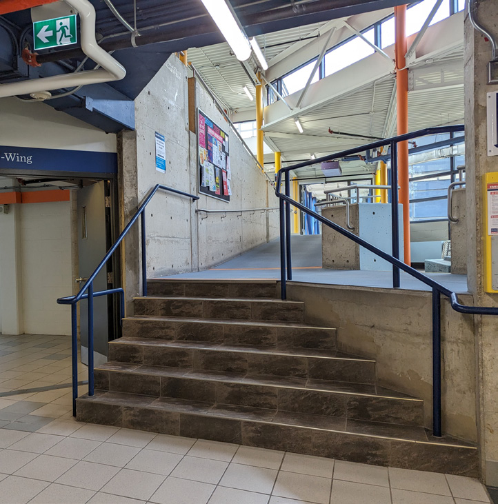 Ramps, particularly in specific areas were difficult for participants to find or notice, with optional ramps being used only once. One participant preferred using a ramp but missed it and took the stairs instead. Stairs posed challenges for multiple participants, who were cautious ascending or descending them, regardless of their mobility. A participant specifically found the stairs to the Library disorienting due to the lack of clear visual markers such as bright colours or depth indicators mentioning a struggle with visual depth perception.